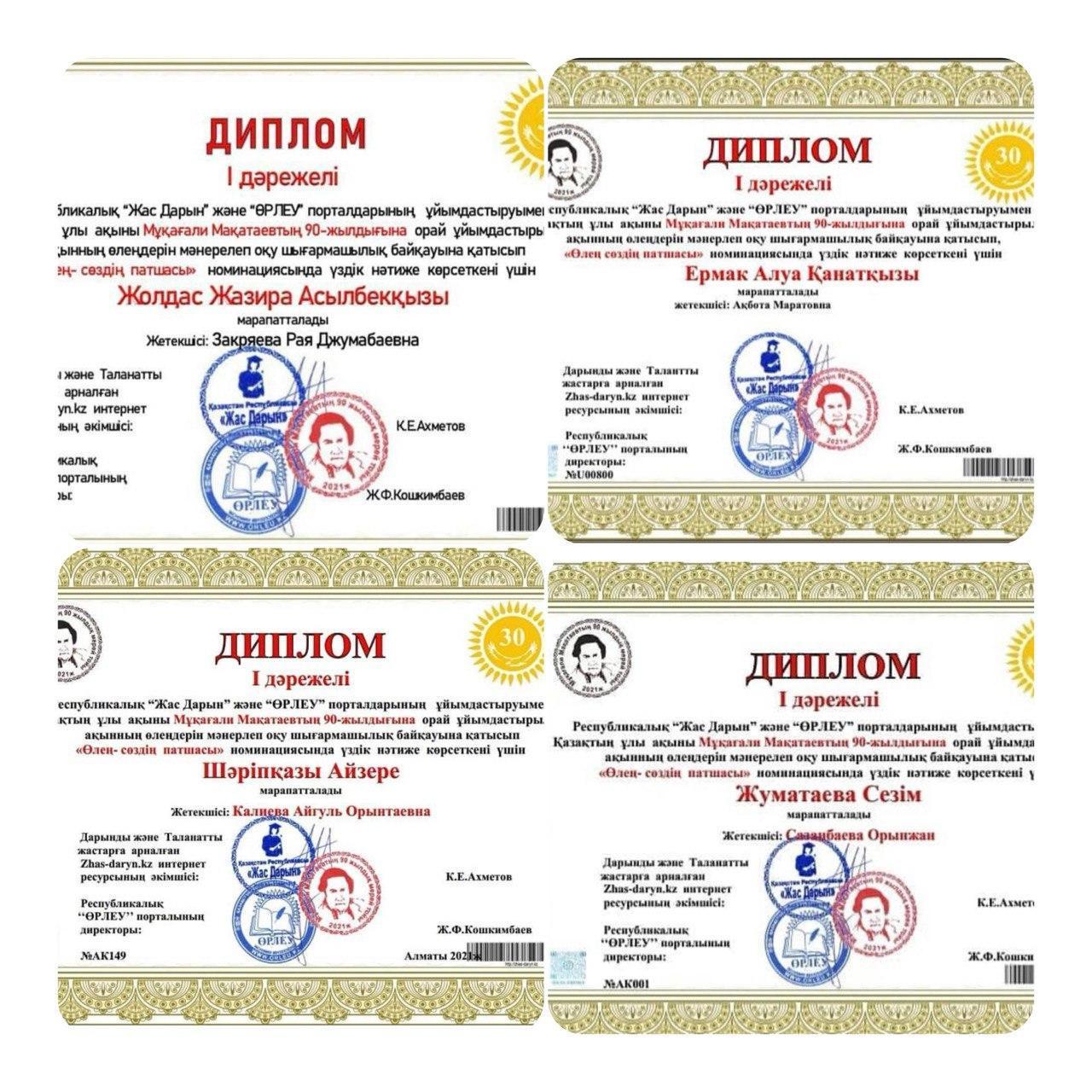 Республикалық "Жас Дарын" және "Өрлеу" порталдарының ұйымдастыруымен Қазақтың ұлы ақыны М.Мақатаевтың 90 - жылдығына орай ұйымдастырылған ақынның өлеңдерін мәнерлеп оқу шығармашылық байқауына қатысып "Өлең - сөздің патшасы" номинациясында үздік