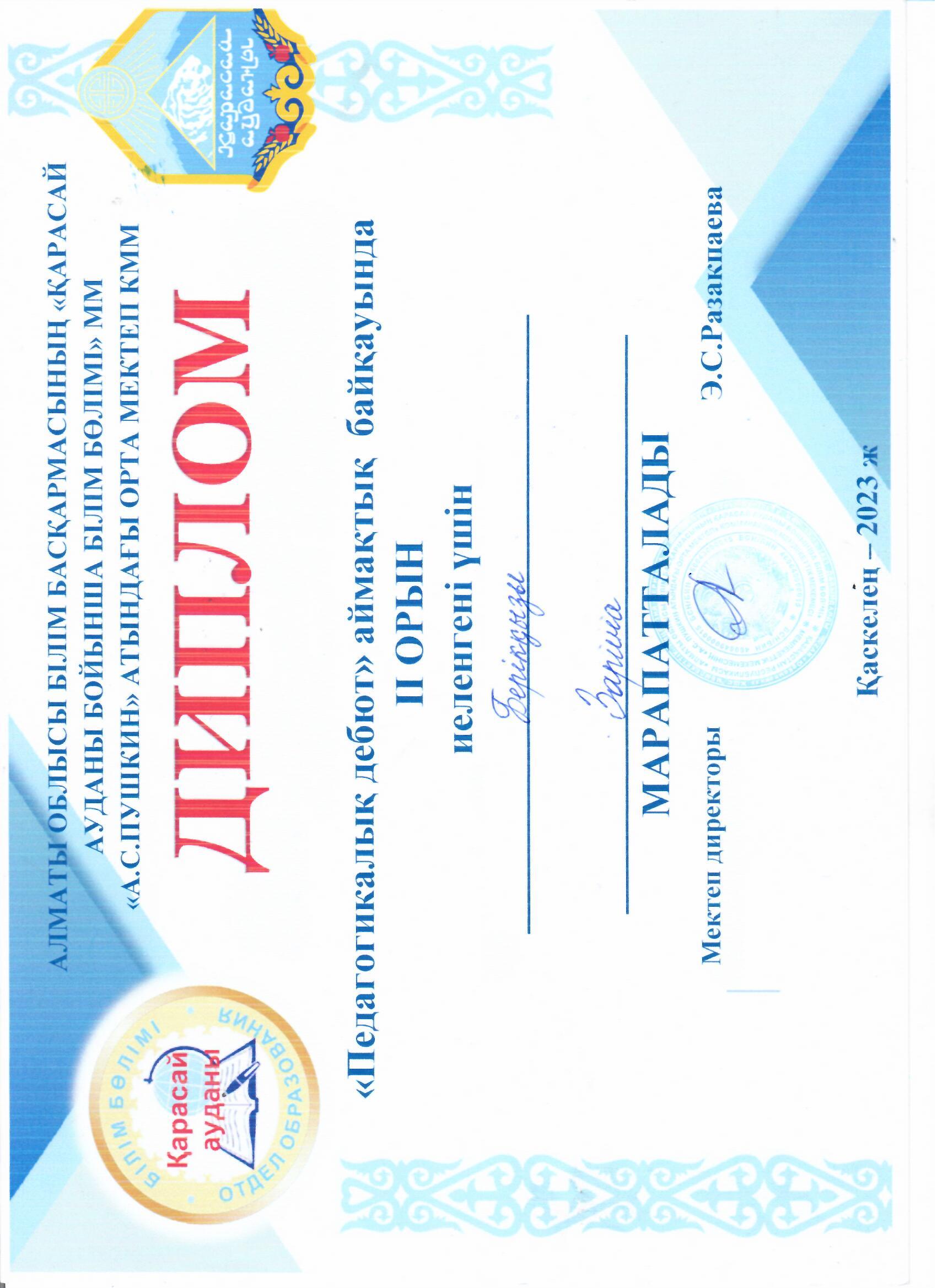 Аймақтық байқаудың ІІ орын иегері-Берікқызы Зарина » С. Керімбеков атындағы орта мектеп