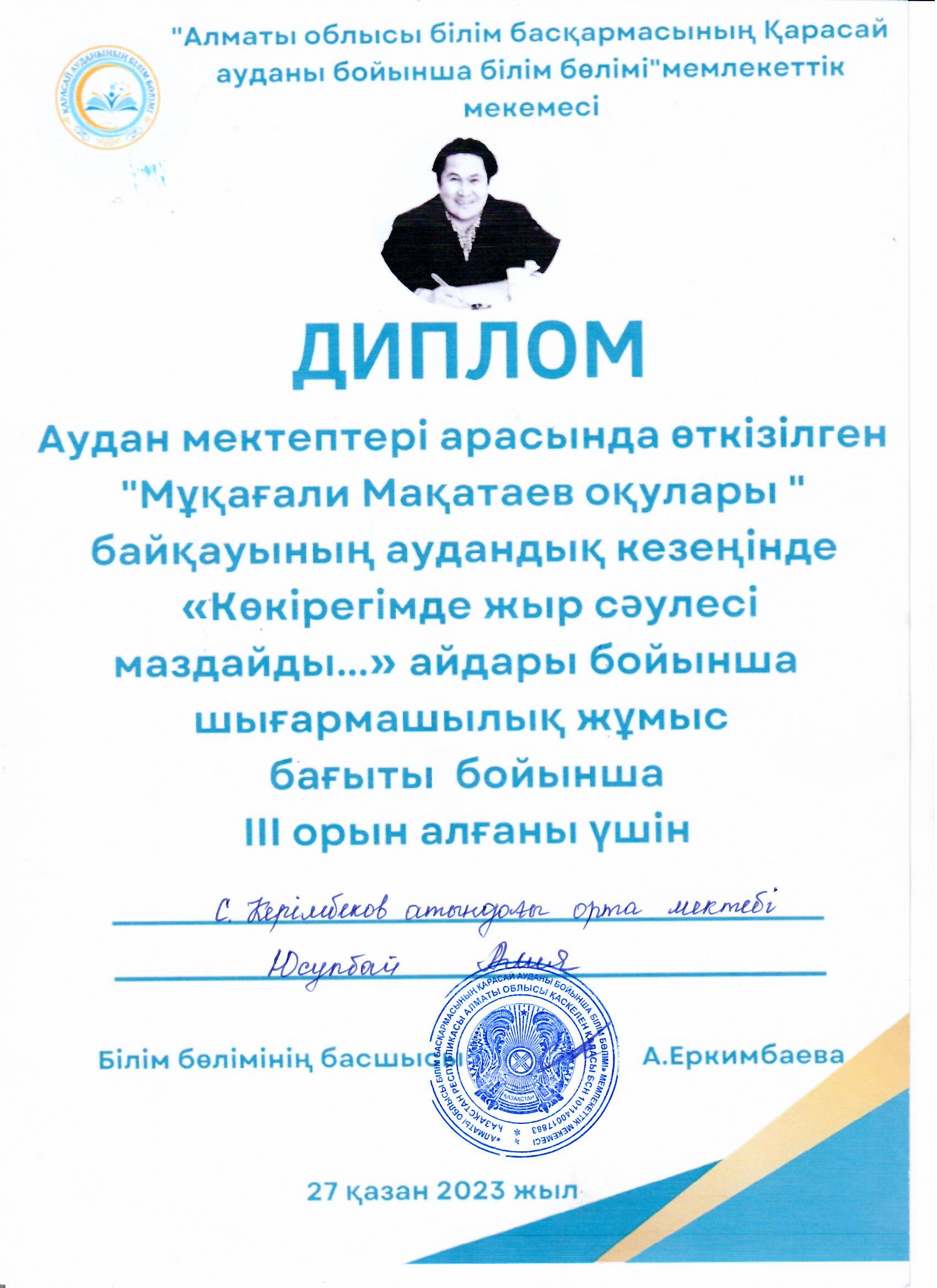"Мұқағали Мақатаев оқулары" байқауының аудандық кезеңінде Юсупбай Алия ІІІ орын иеленді.