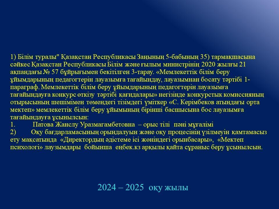 Білім беру педагогтерін бос лауазымға тағайындау конкурсы қорытындысы » С. Керімбеков атындағы орта мектеп