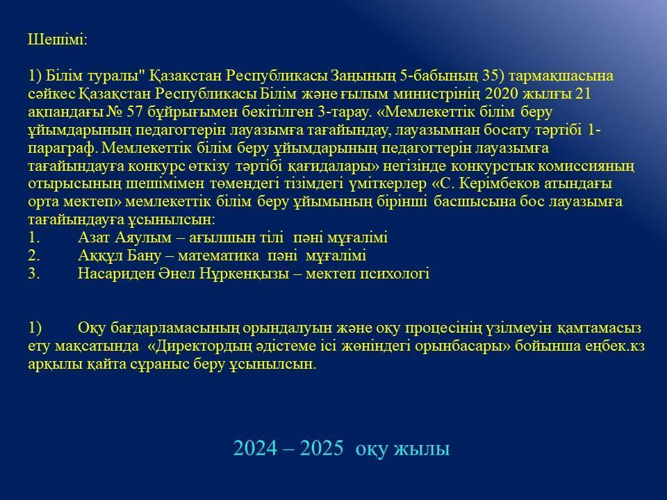 Білім беру педагогтерін бос лауазымға тағайындау конкурсы қорытындысы » С. Керімбеков атындағы орта мектеп