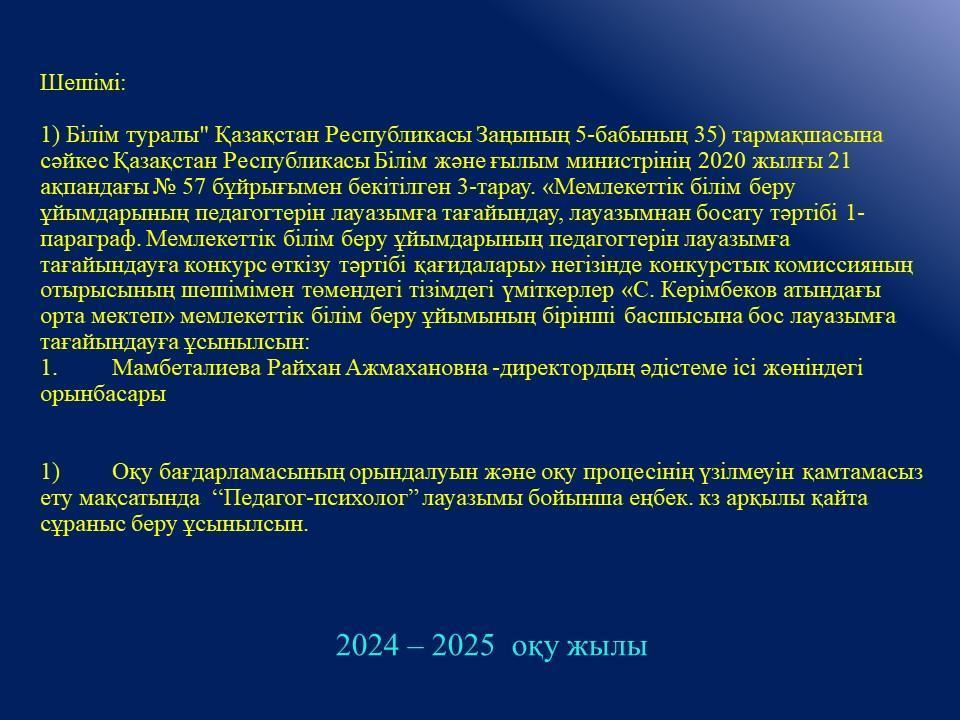 Білім беру педогогтерін бос лауазымға тағайындау конкурсы қорытындысы » С. Керімбеков атындағы орта мектеп