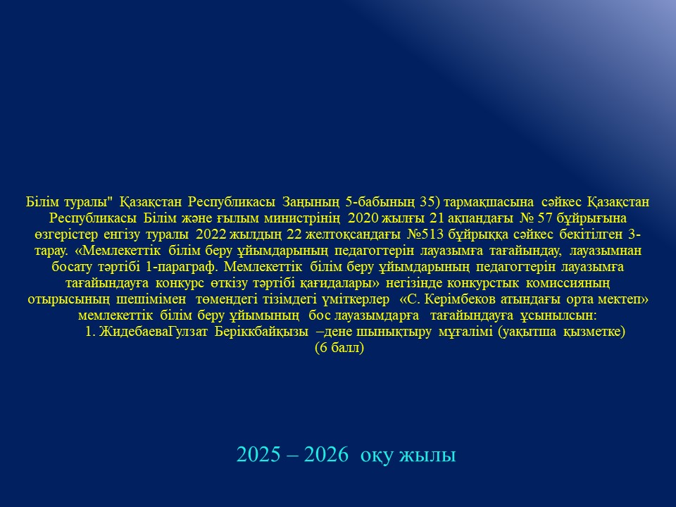 Білім беру педагогтерін бос лауазымға тағайындау конкурсы қорытындысы » С. Керімбеков атындағы орта мектеп