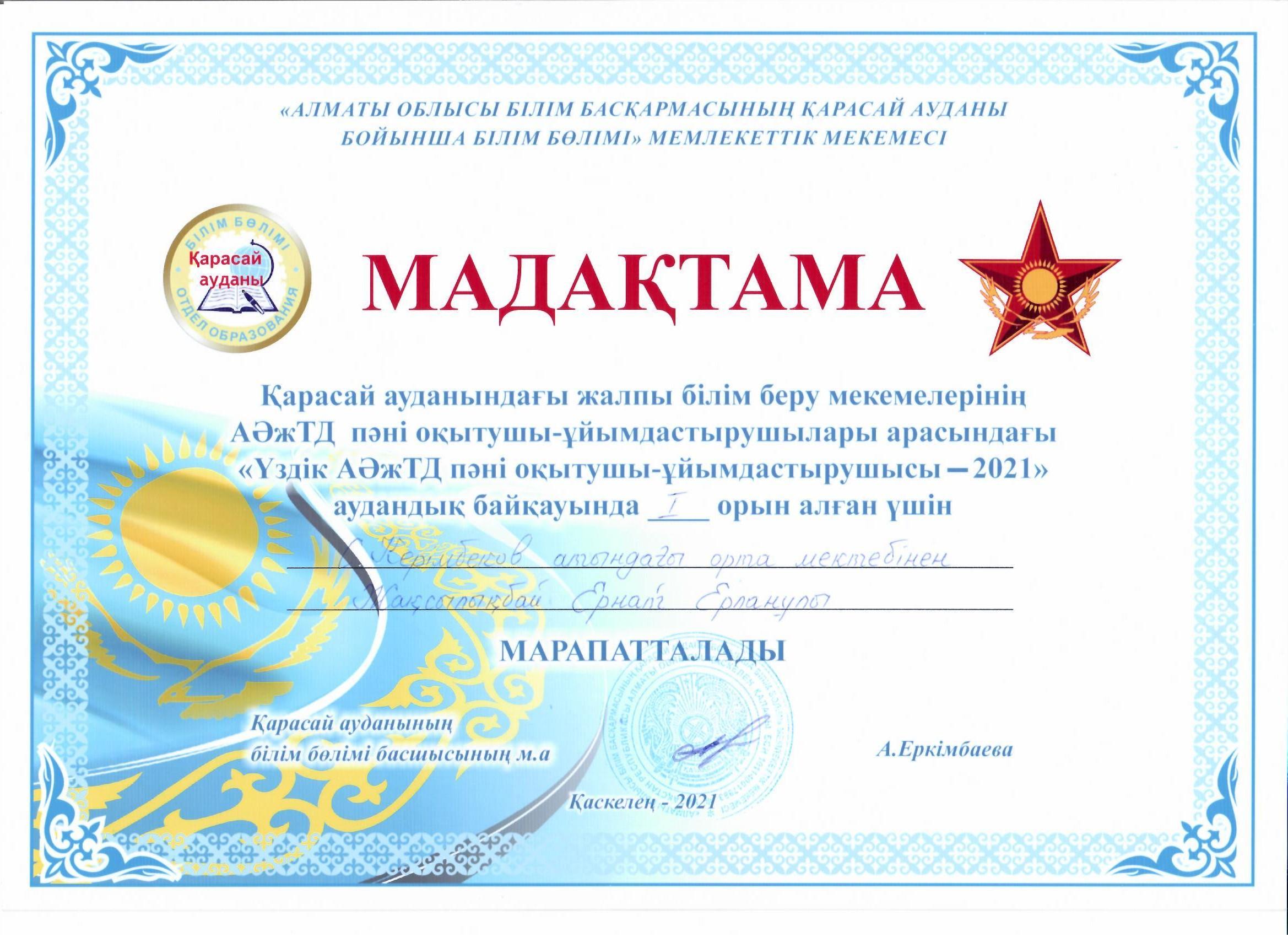 25 октябрь 2021 0 1 2 3 4 5 "Үздік АӘжДТ пәні оқытушысы-ұйымдастырушысы-2021" аудандық байқауы, " Мадақтама, І орын", Жақсылықбай Ернат Ерланұлы