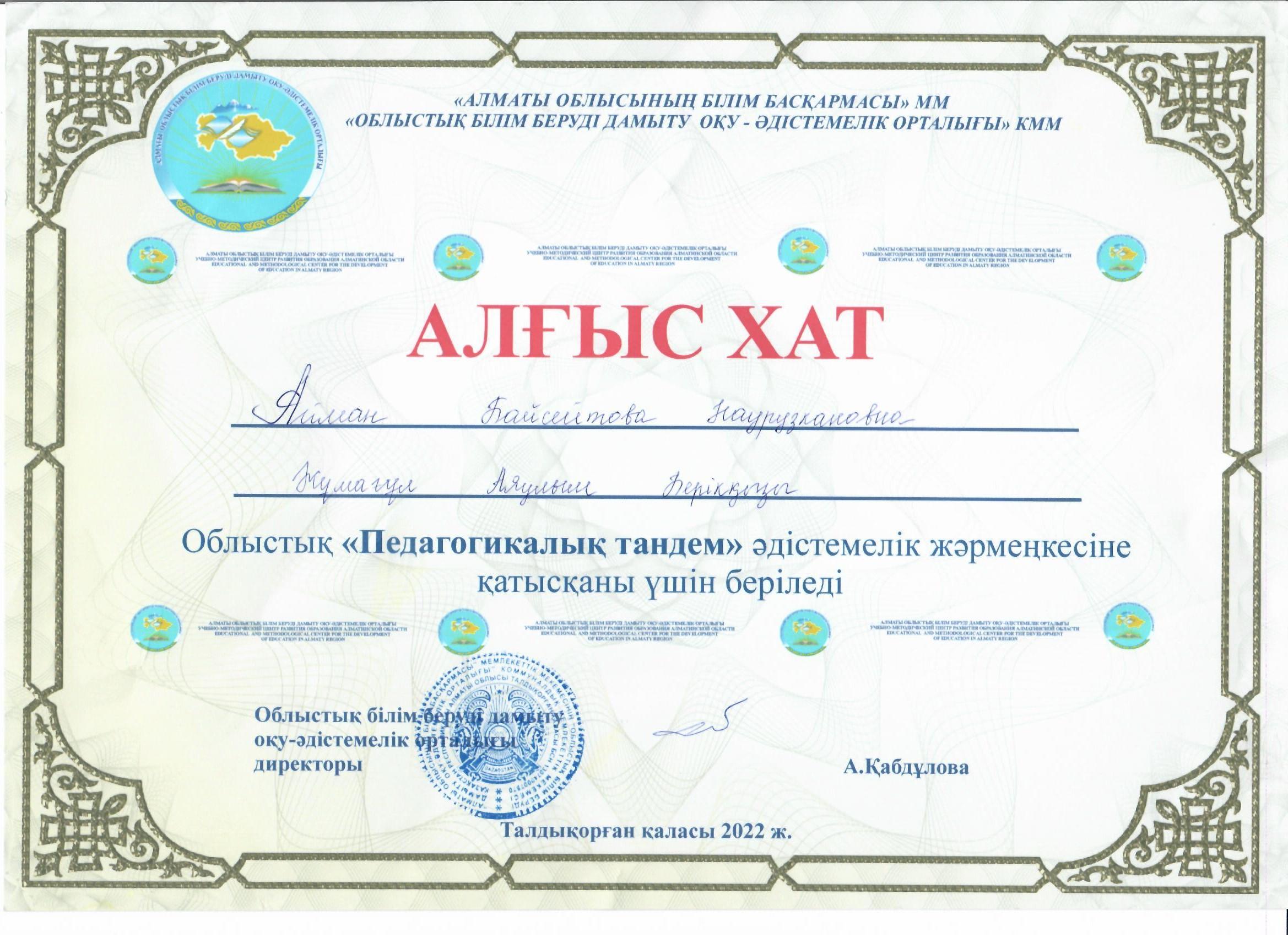 28 март 2022 0 1 2 3 4 5 Облыстық"Педагогикалық тандем" әдістемелік жәрмеңкесі,"Алғыс Хат", Байсейтова Айман Наурузкановна, Жұмағұл Аяулым Берікқызы