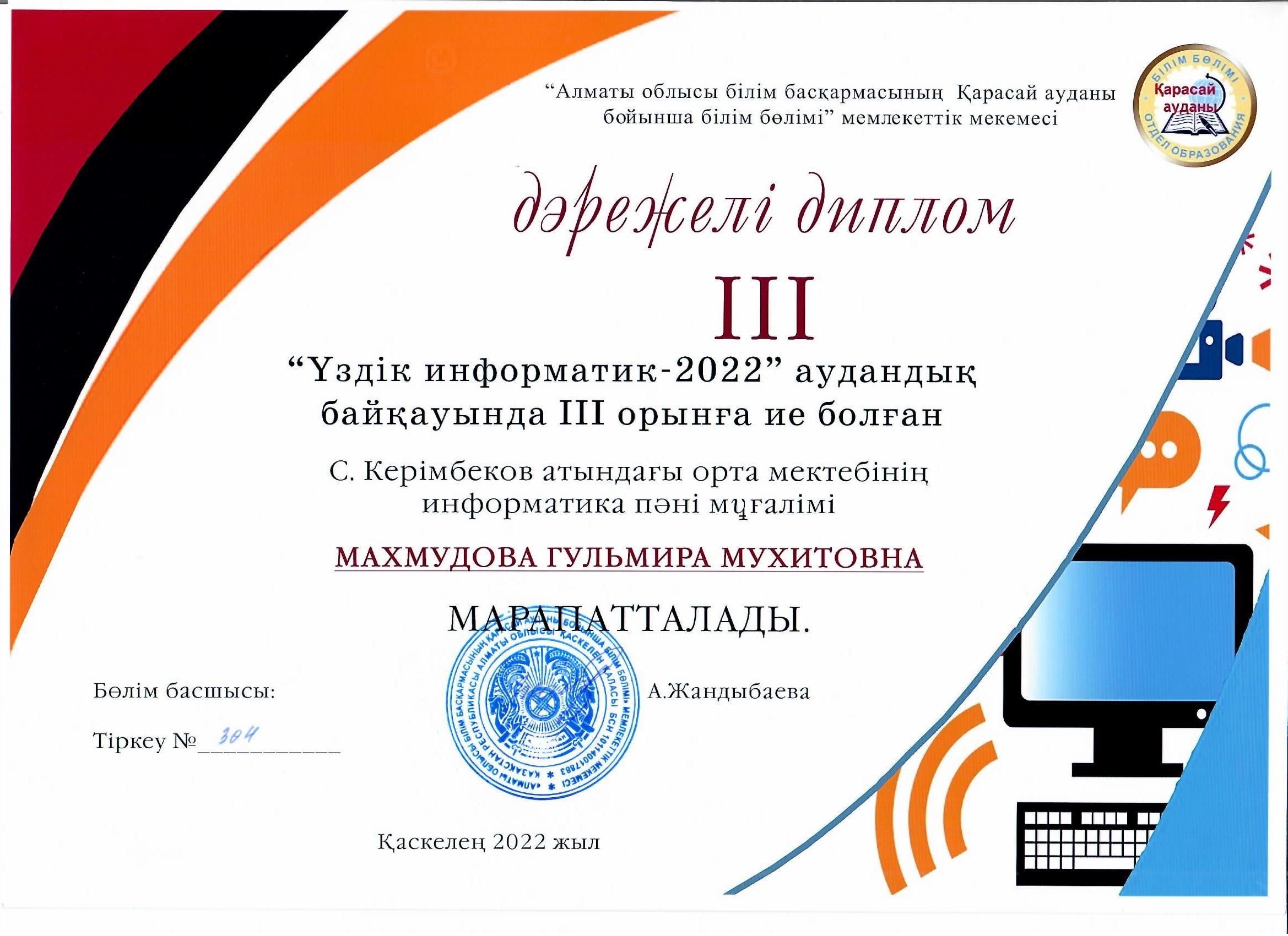 21 февраль 2022 0 1 2 3 4 5 "Үздік Информатик-2022" байқау, "ІІІ дәрежелі Диплом", Махмудова Гульмира Мухитовна