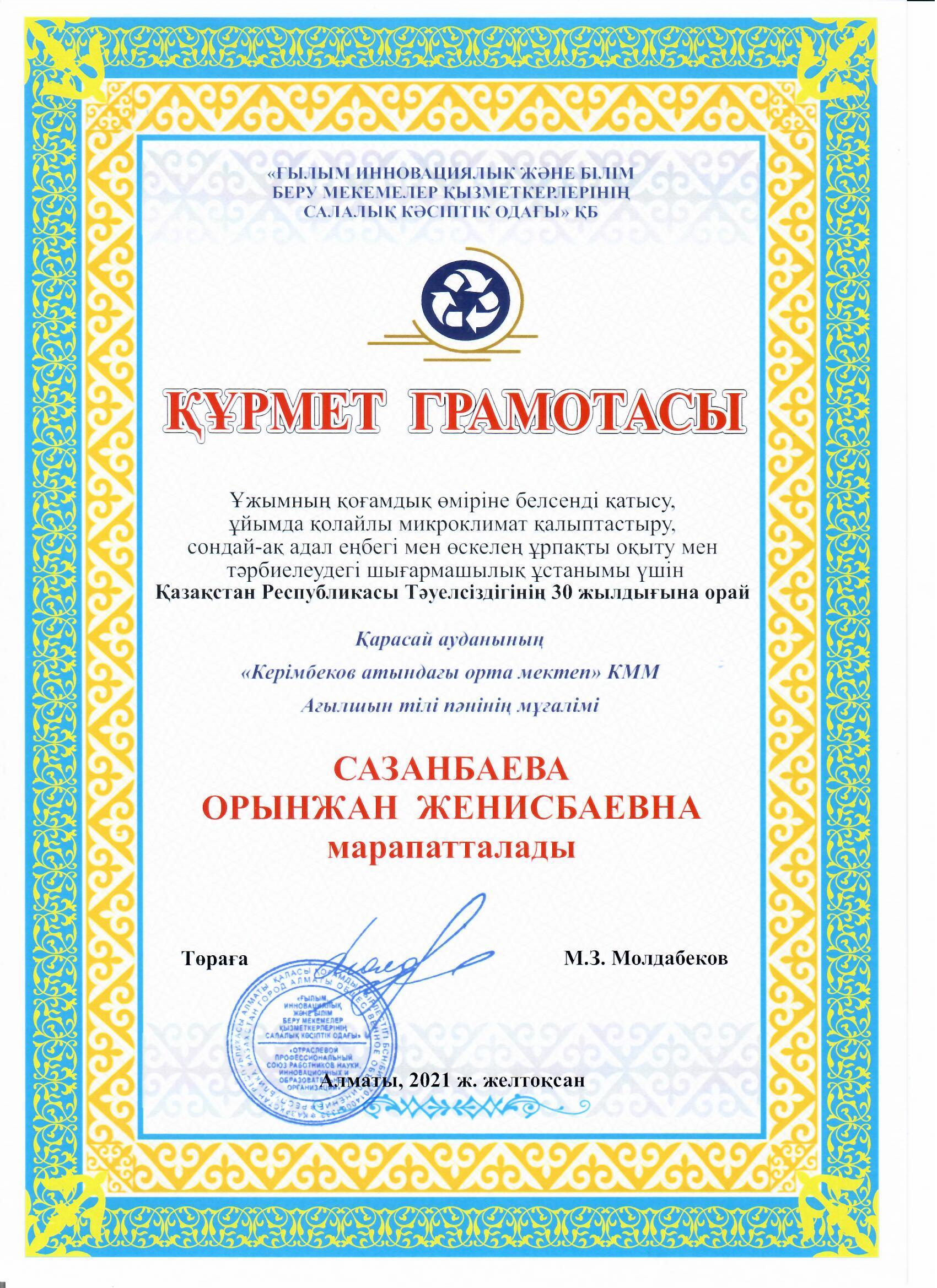 20 декабрь 2021 0 1 2 3 4 5 "Ғылым Инновациялық және Білім беру мекемелер қызметкерлерінің салаллық кәсіптік одағы" ҚБ, "Құрмет Грамотасы", Сазанбаева Орынжан Женисбаевна