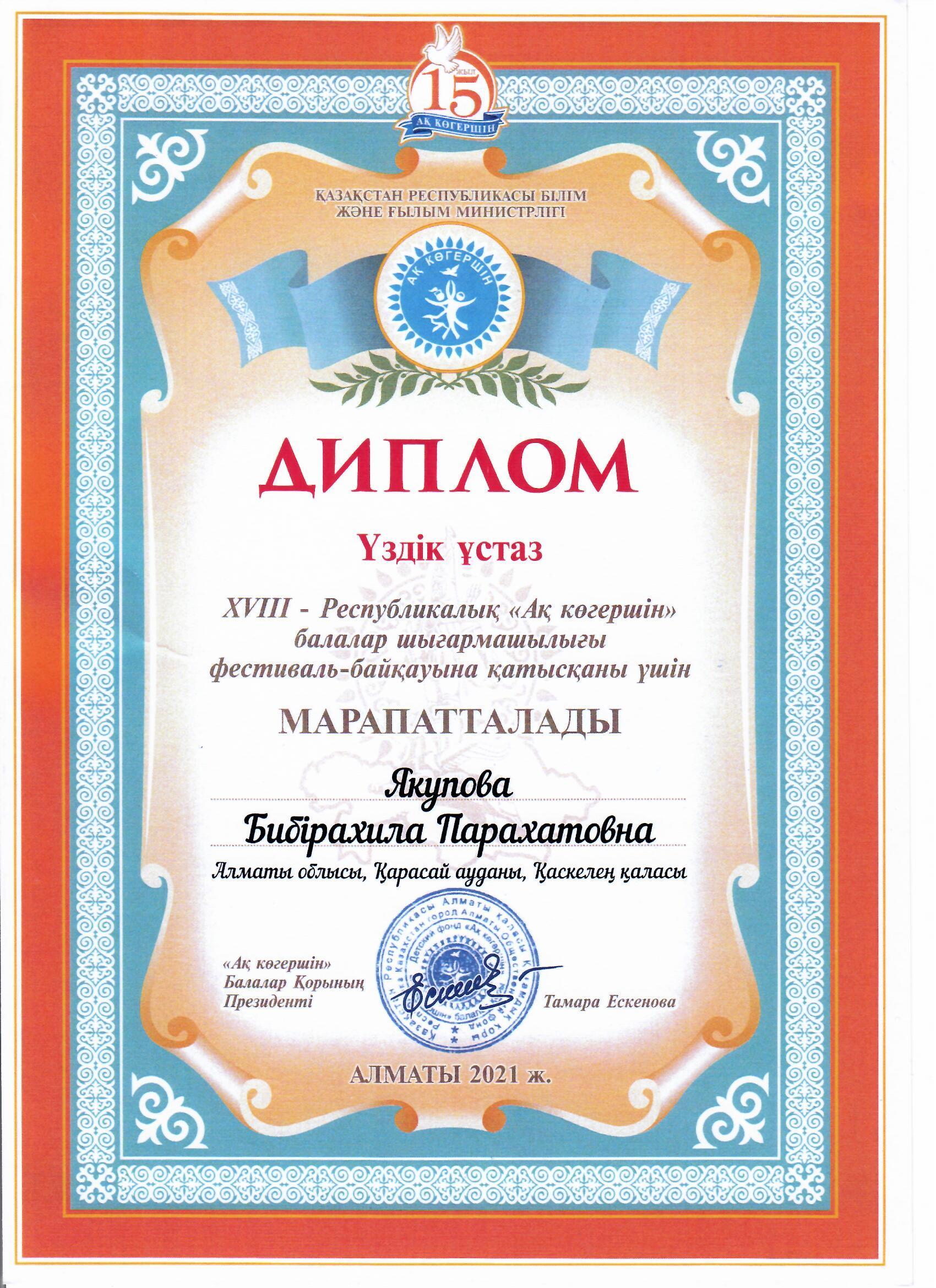 06 декабрь 2021 0 1 2 3 4 5 "Ақ көгершін" фестиваль-байқауы, "Үздік Ұстаз, Диплом", Якупова Бибірахила Парахатовна