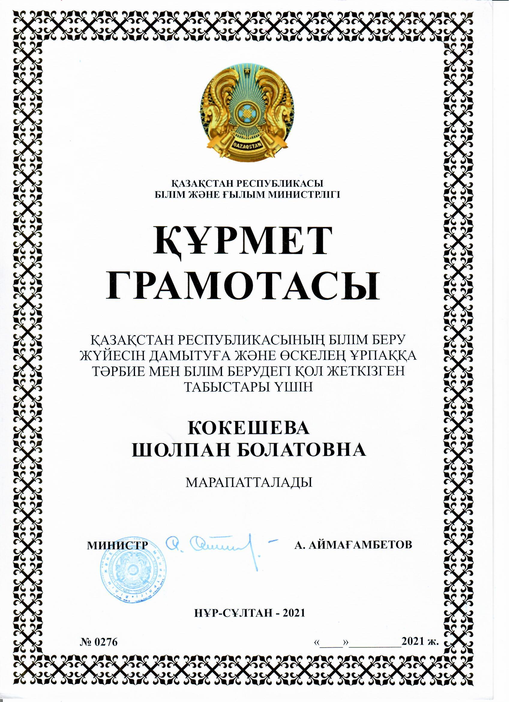 06 декабрь 2021 0 1 2 3 4 5 ҚАЗАҚСТАН РЕСПУБЛИКАСЫ БІЛІМ ЖӘНЕ ҒЫЛЫМ МИНИСТРЛІГІ, Құрмет грамотасы, Кокешева Шолпан Болатовна